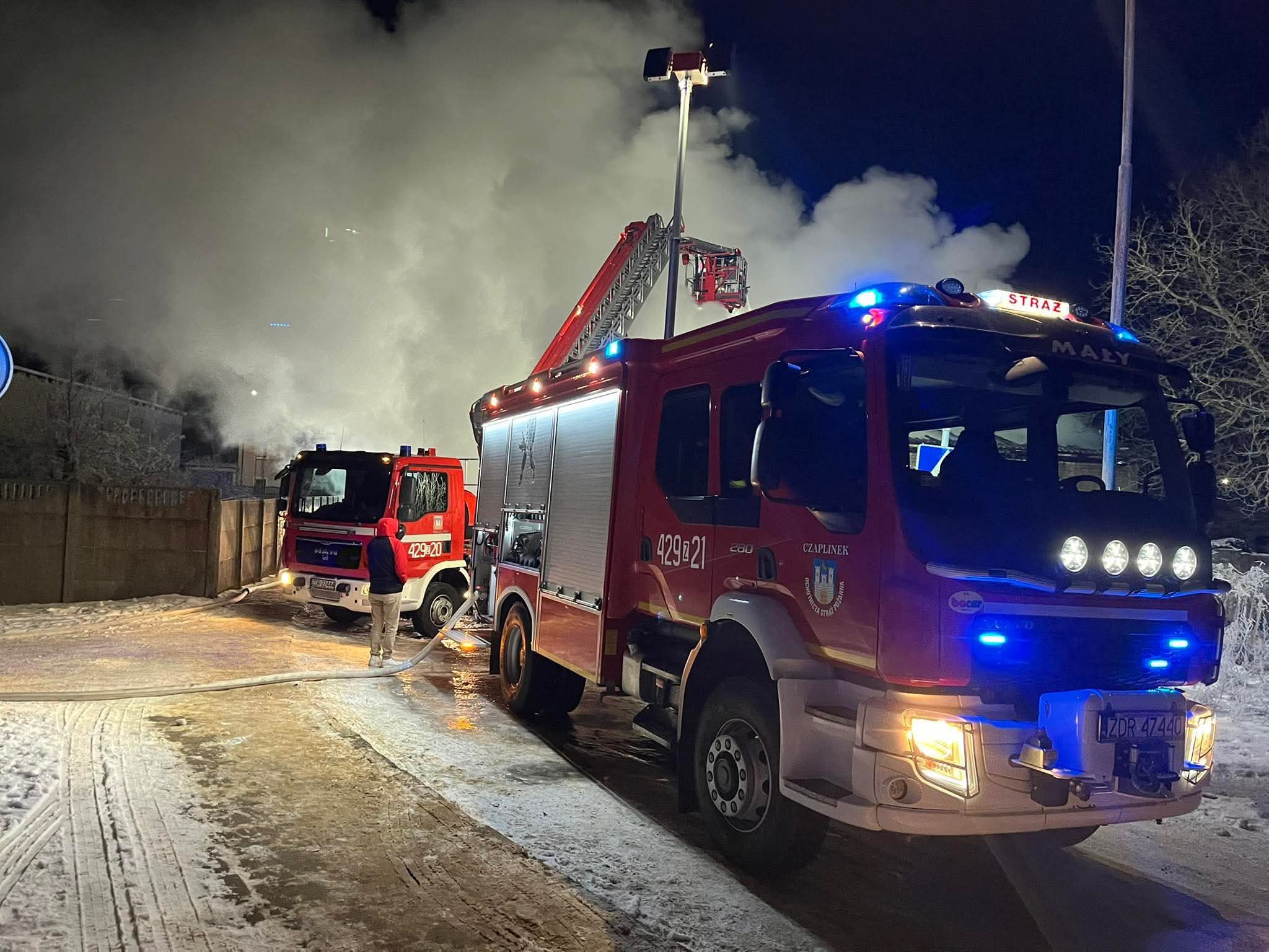 9.01.2026r. ok. godz. 1:30 doszło do pożaru w miejscowości Czaplinek. Na miejsce natychmiast zadysponowano zastępy straży pożarnej. Po dotarciu pierwszych służb na miejsce, okazało się, że budynek gospodarczy znajdujący się na jednej z posesji, stanął w płomieniach. Niezwłocznie wprowadzono rotę w aparatach ODO w natarciu w celu ugaszenia żywiołu. Kolejny prąd wody podano z podnośnika koszowego. Na szczęście nikt nie ucierpiał w zdarzeniu.